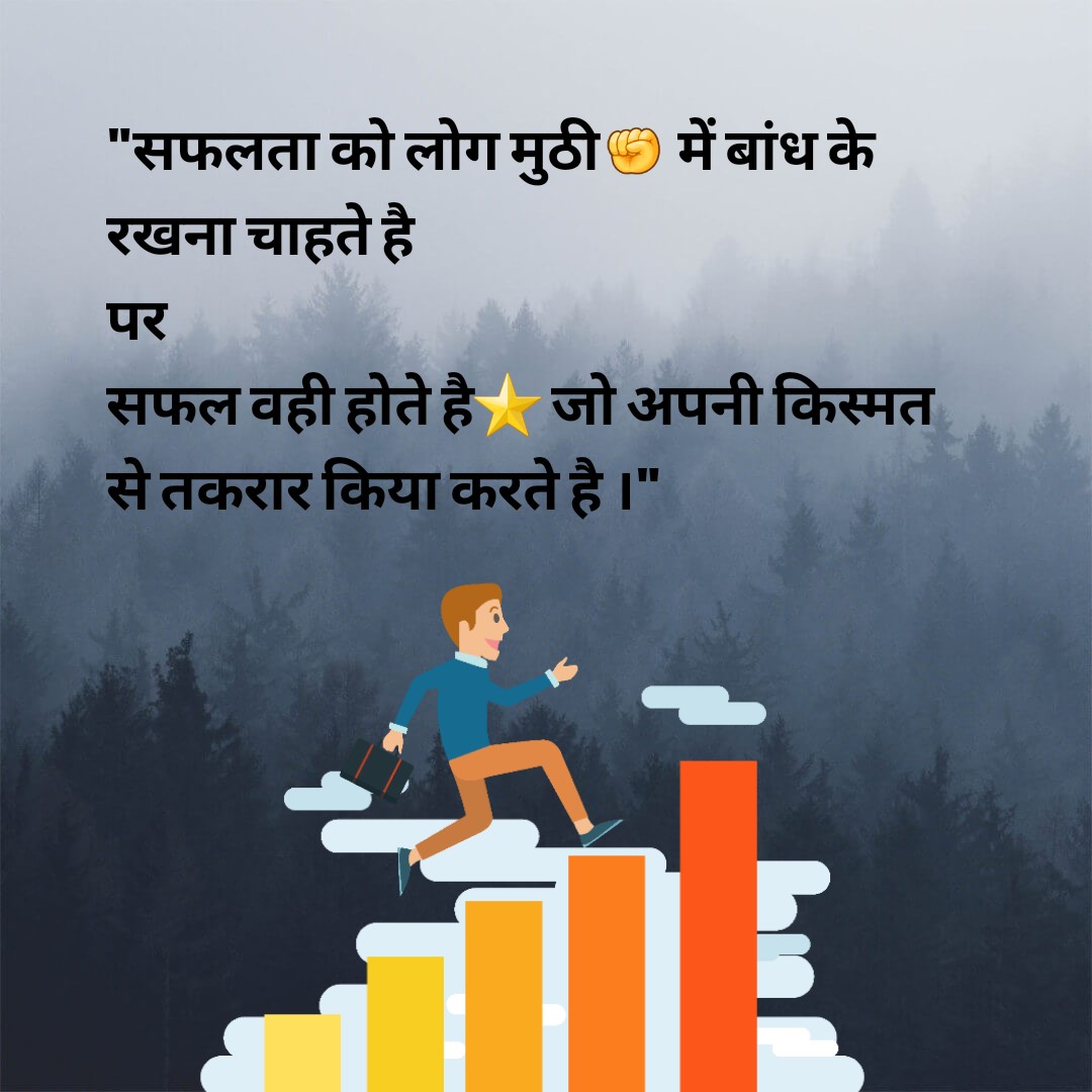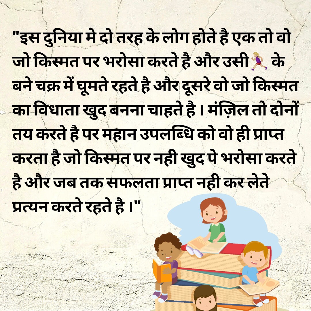 “इस दुनिया मे दो तरह के लोग होते है एक तो वो जो किस्मत पर भरोसा करते है और उसी के बने चक्र में घूमते रहते है और दूसरे वो जो किस्मत का विधाता खुद बनना चाहते है । मंज़िल तो दोनों तय करते है पर महान उपलब्धि को वो ही प्राप्त करता है जो किस्मत पर नही खुद पे भरोसा करते है और जब तक सफलता प्राप्त नही कर लेते प्रत्यन करते रहते है ।”