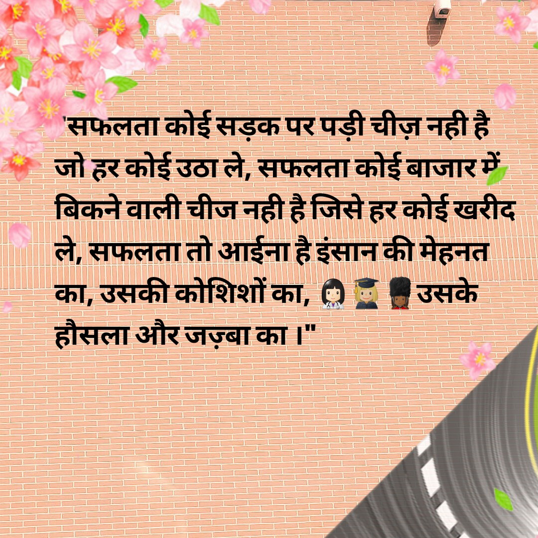 “सफलता कोई सड़क पर पड़ी चीज़ नही है जो हर कोई उठा ले, सफलता कोई बाजार में बिकने वाली चीज नही है जिसे हर कोई खरीद ले, सफलता तो आईना है इंसान की मेहनत का, उसकी कोशिशों का उसके हौसला और जज़्बा का ।”